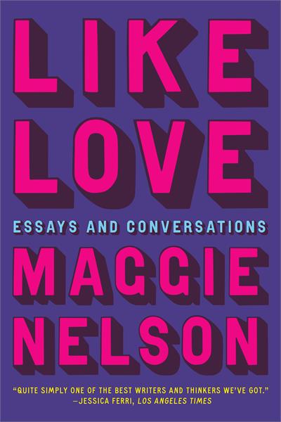 Like Love is a momentous, raucous collection of essays drawn from twenty years of Maggie Nelson’s brilliant work. These profiles, reviews, remembrances, tributes, and critical essays, as well as several conversations with friends and idols, bring to life Nelson’s passion for dialogue and dissent. The range of subjects is wide—from Prince to Carolee Schneemann to Matthew Barney to Lhasa de Sela to Kara Walker—but certain themes recur: intergenerational exchange; love and friendship; feminist and queer issues, especially as they shift over time; subversion, transgression, and perversity; the roles of the critic and of language in relation to visual and performance arts; forces that feed or impede certain bodies and creators; and the fruits and follies of a life spent devoted to making.